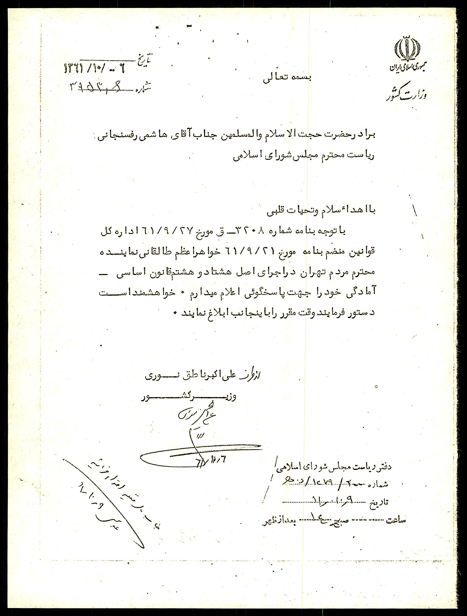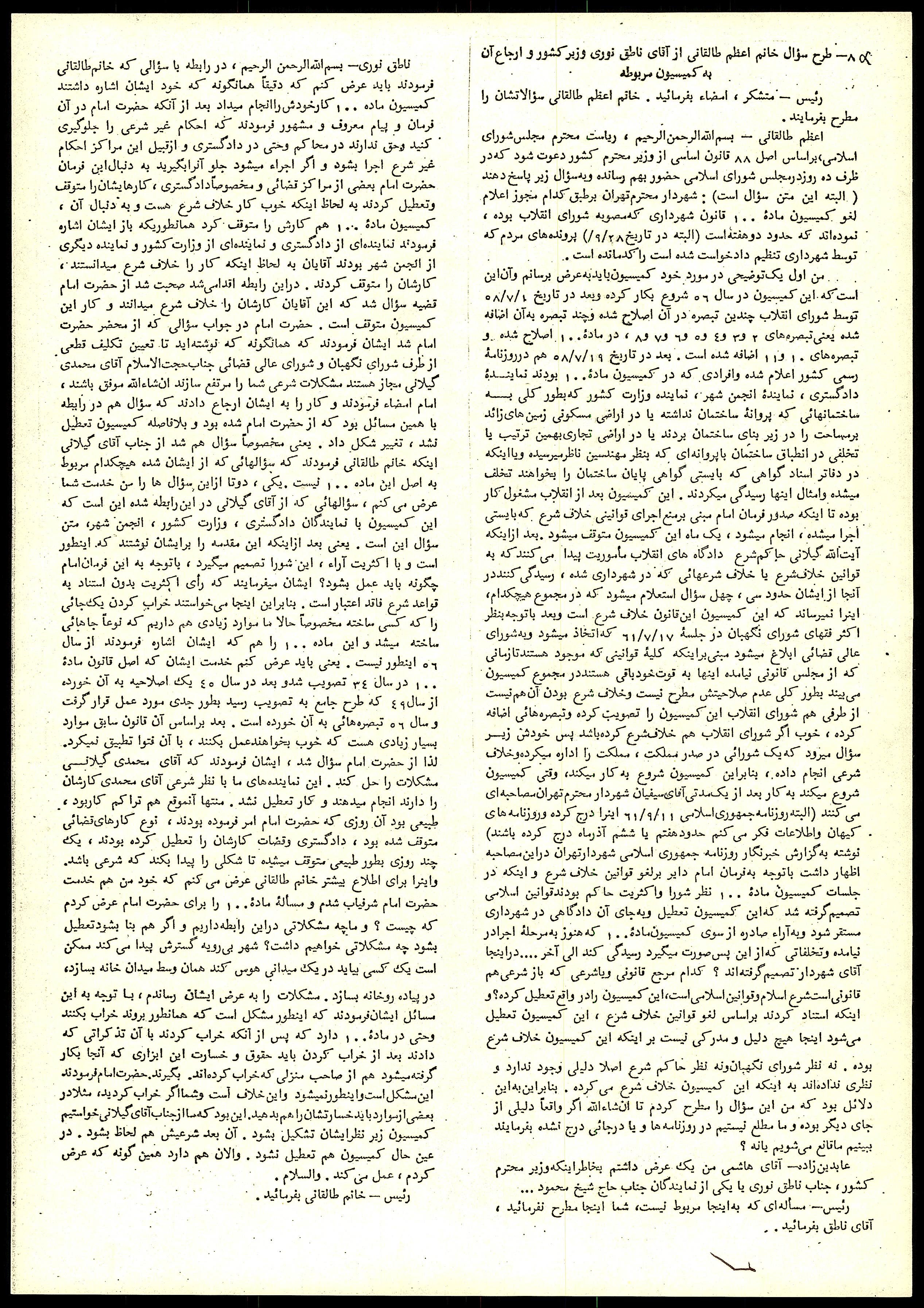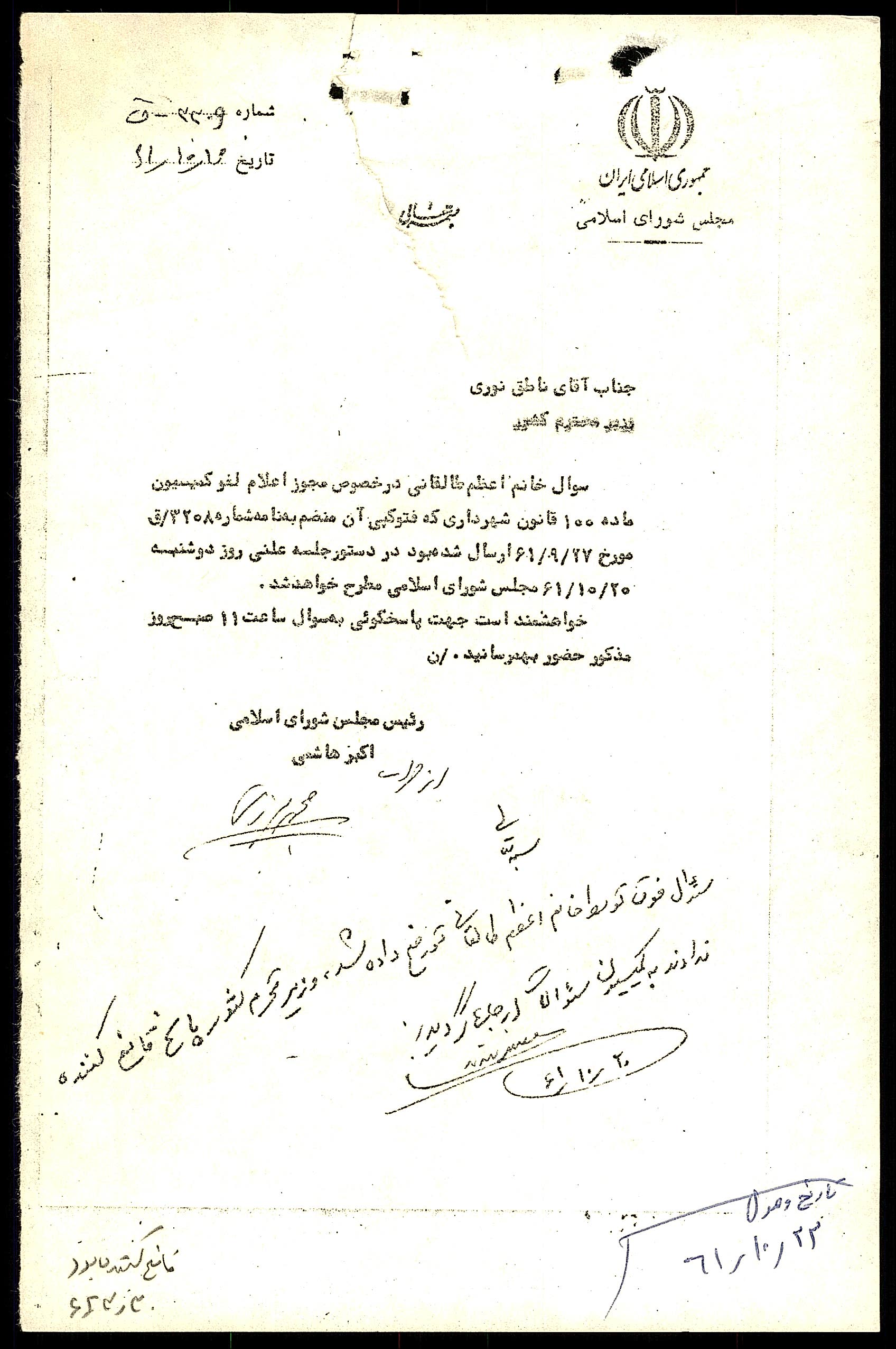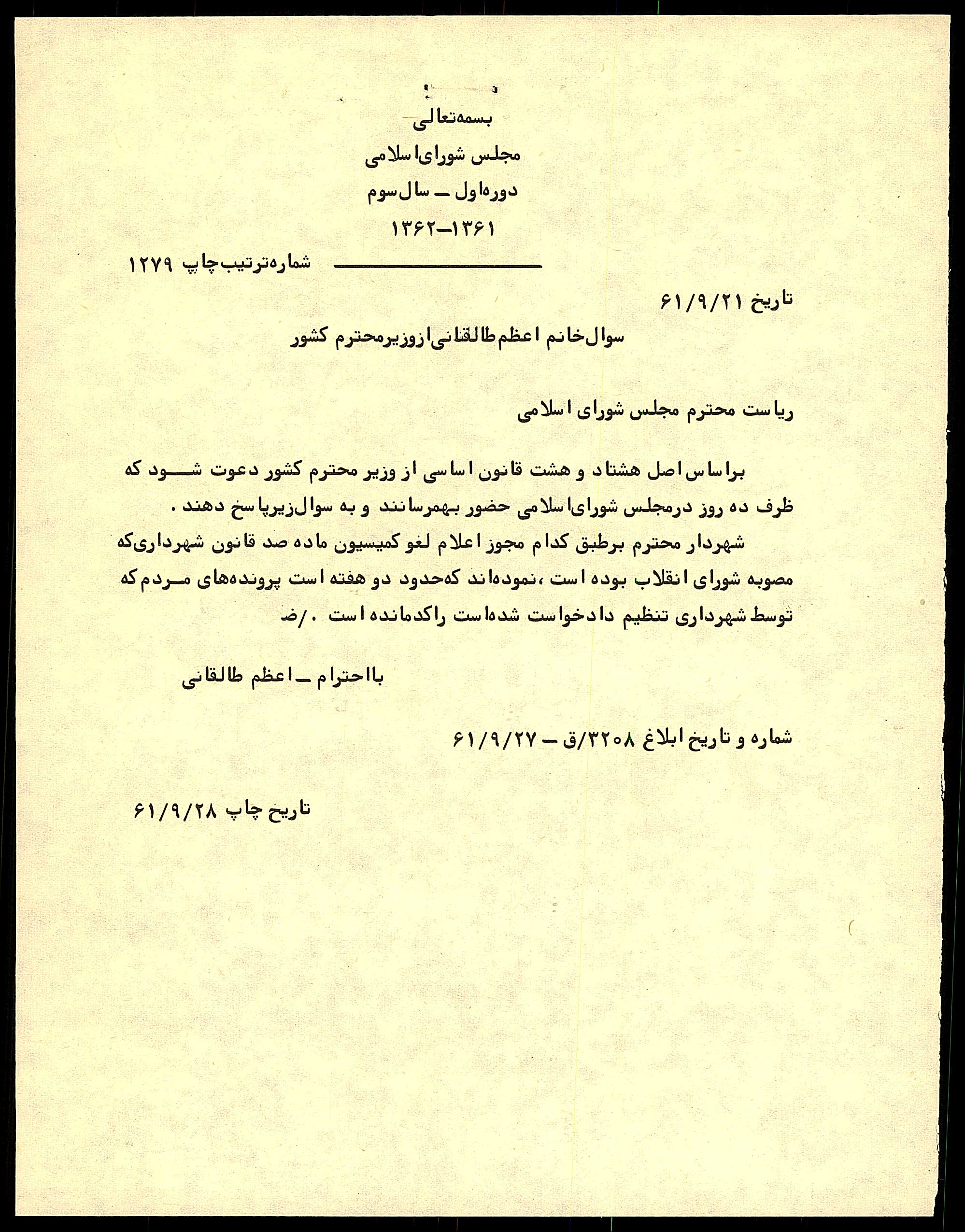 مكاتبات مربوط به طرح سوال خانم اعظم طالقاني نماينده مجلس شوراي اسلامي از وزير كشور درباره اقدام شهرداري تهران در خصوص لغو قانون مصوب شوراي انقلاب درباره ماده 100شهرداري-1361