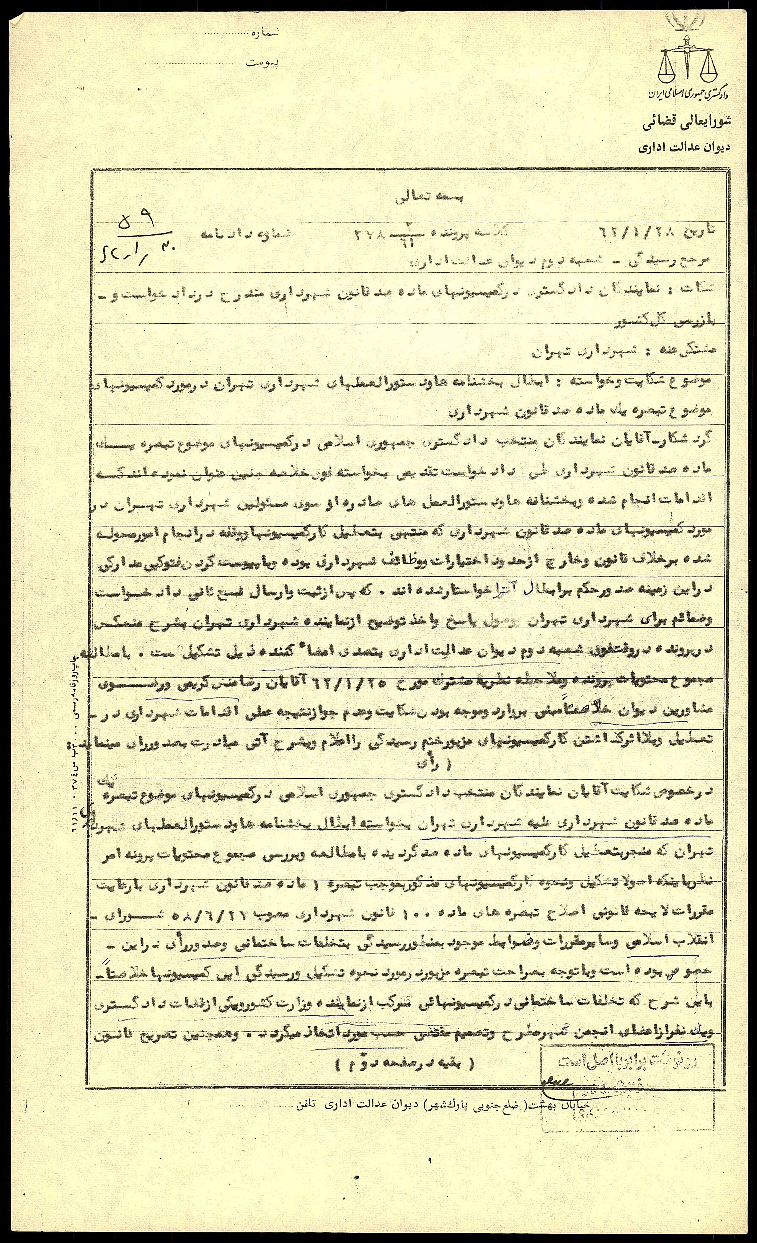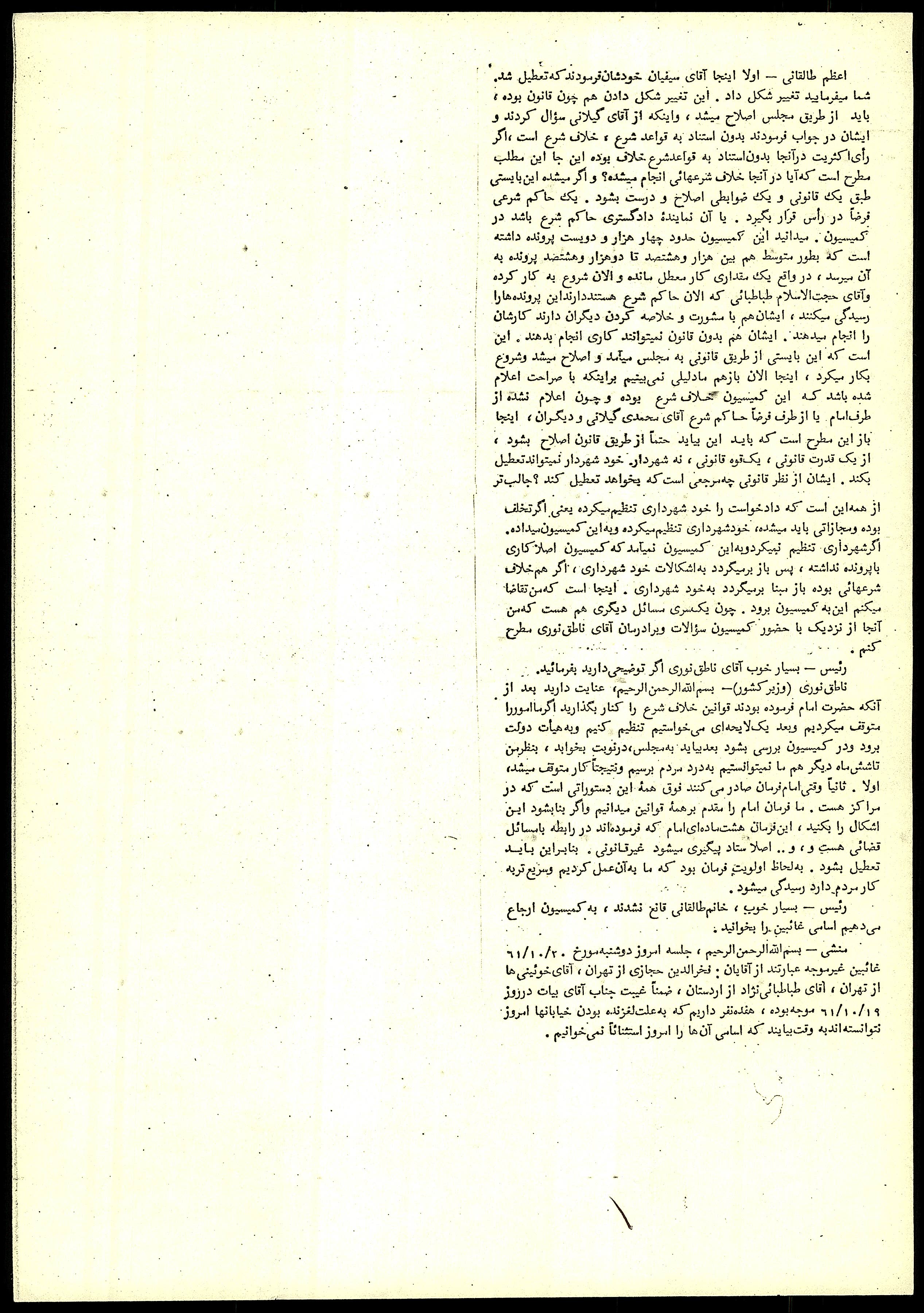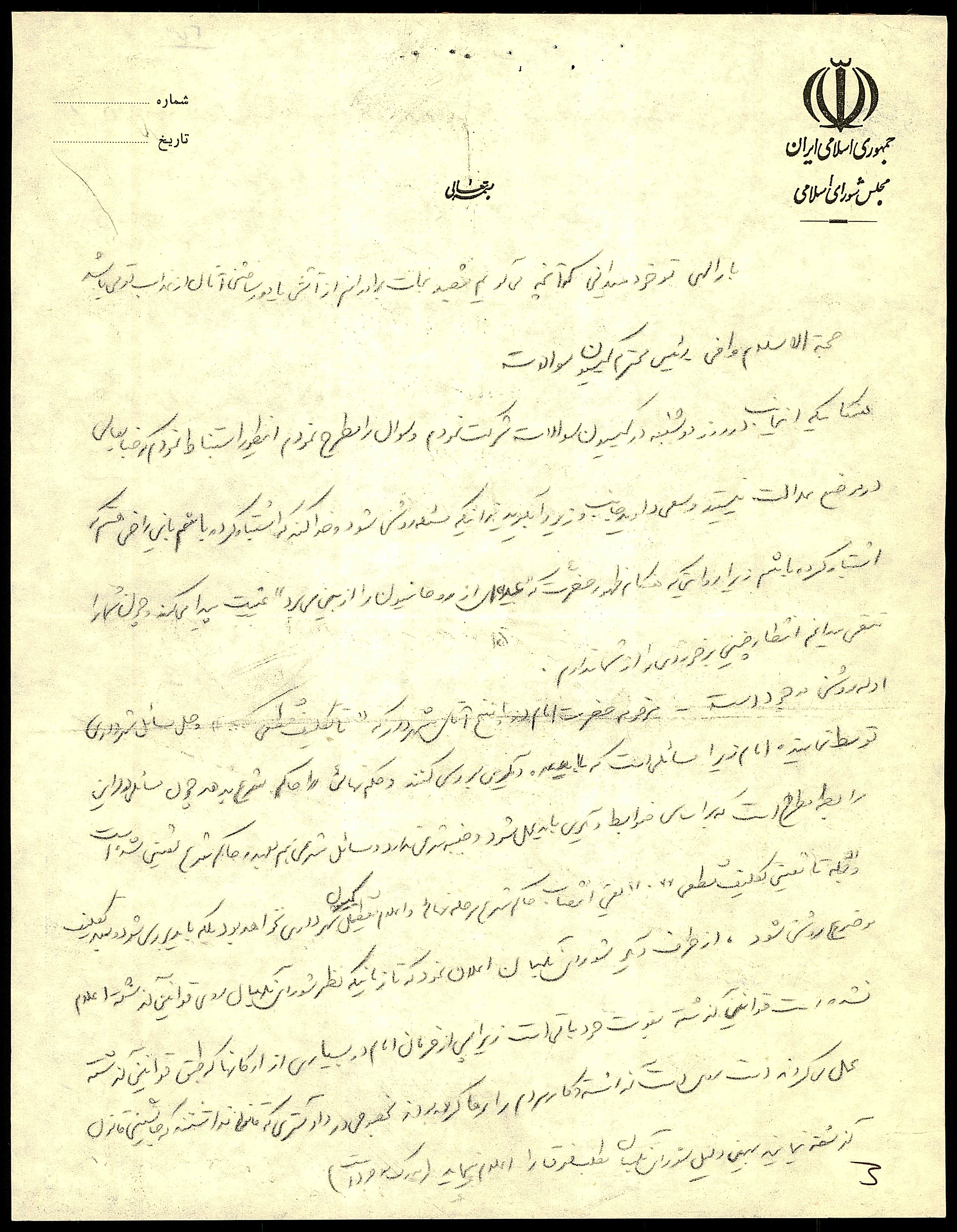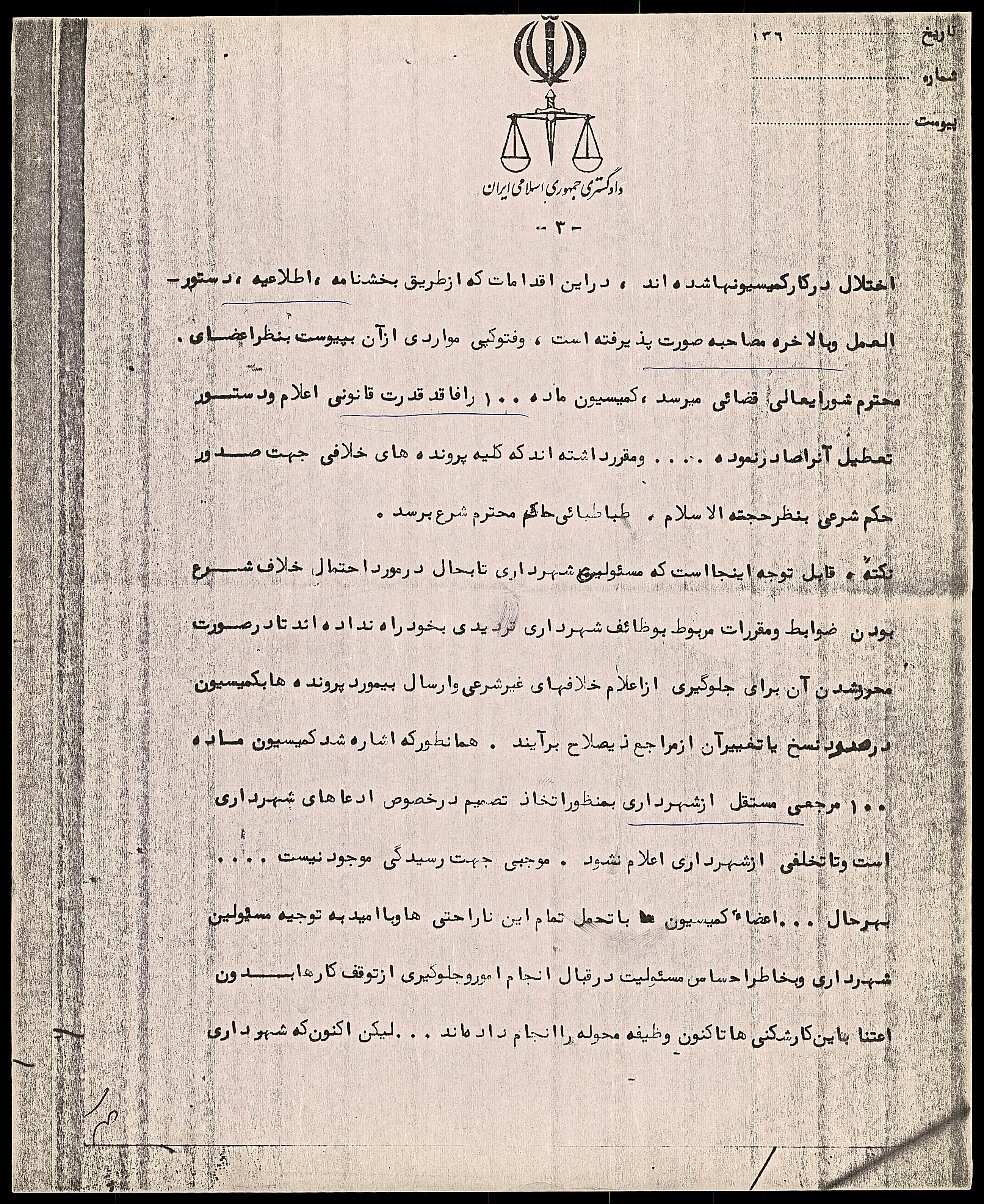 مكاتبات مربوط به طرح سوال خانم اعظم طالقاني نماينده مجلس شوراي اسلامي از وزير كشور درباره اقدام شهرداري تهران در خصوص لغو قانون مصوب شوراي انقلاب درباره ماده 100شهرداري-1361