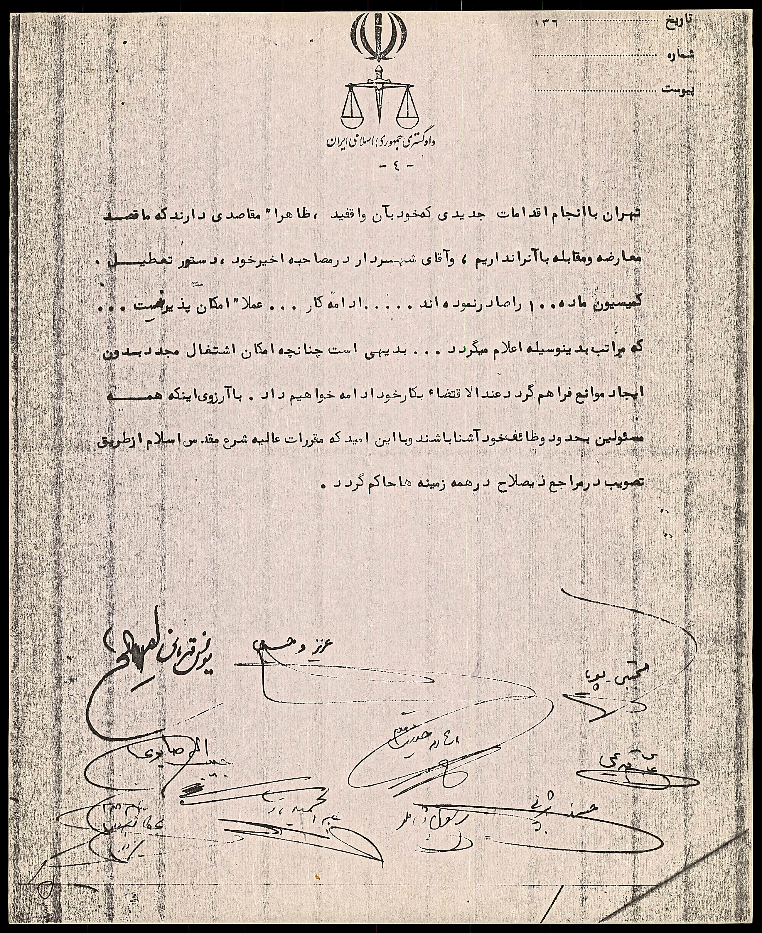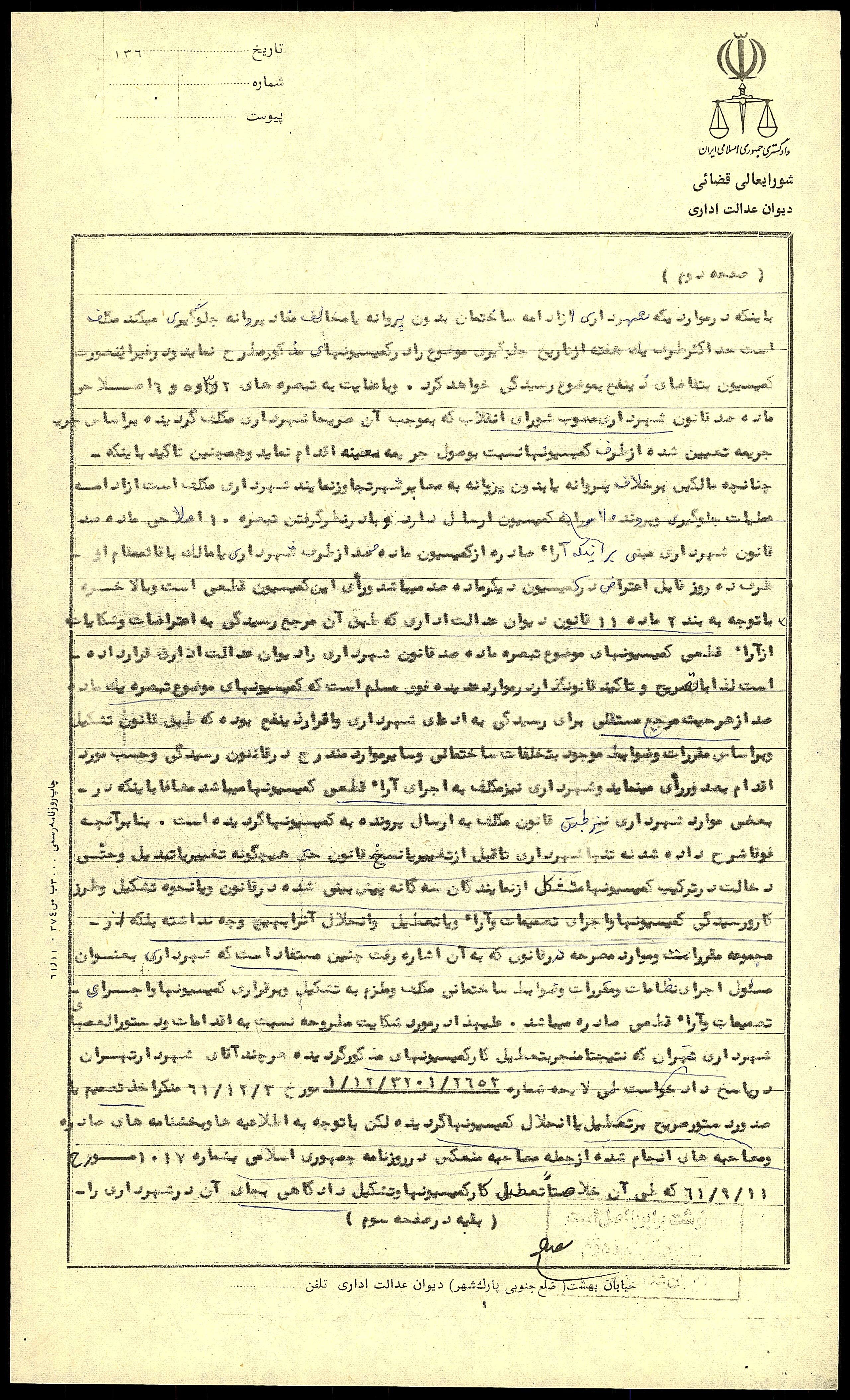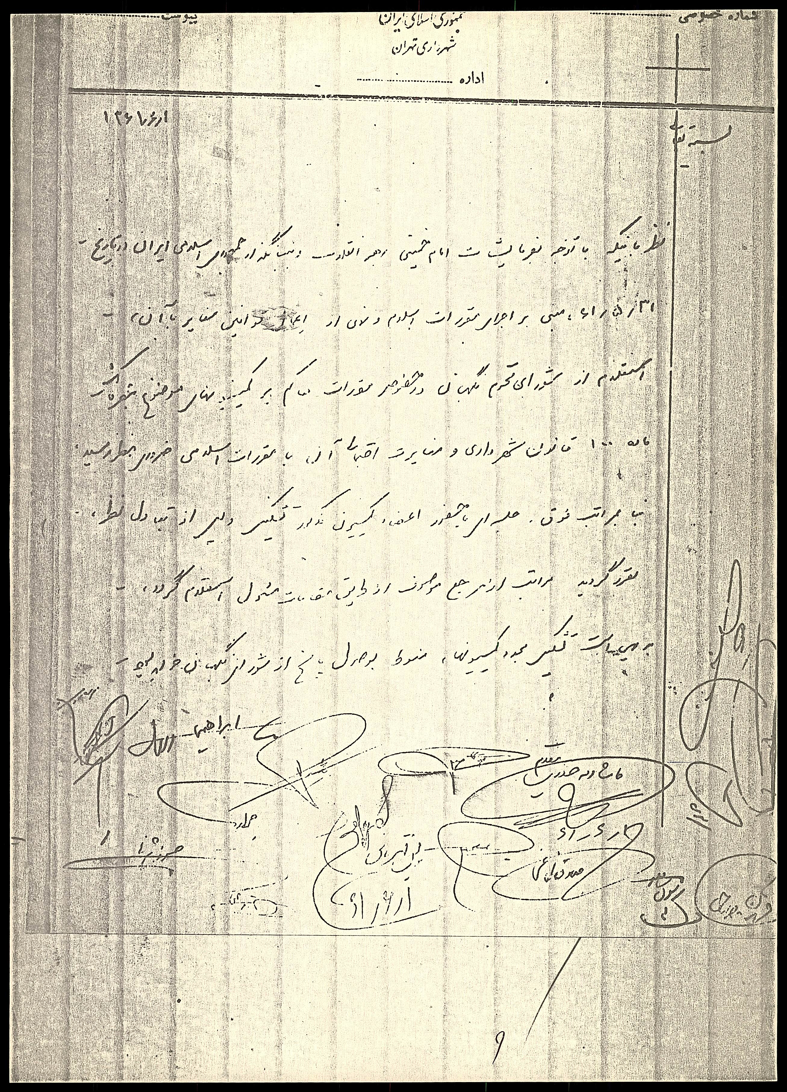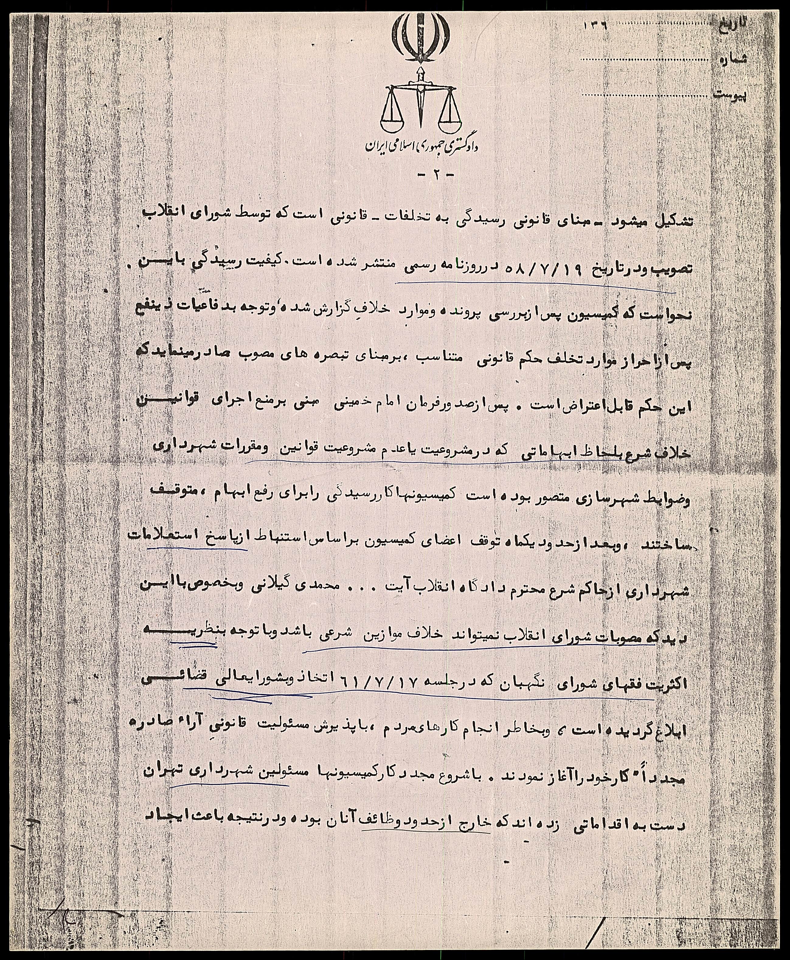 مكاتبات مربوط به طرح سوال خانم اعظم طالقاني نماينده مجلس شوراي اسلامي از وزير كشور درباره اقدام شهرداري تهران در خصوص لغو قانون مصوب شوراي انقلاب درباره ماده 100شهرداري-1361
