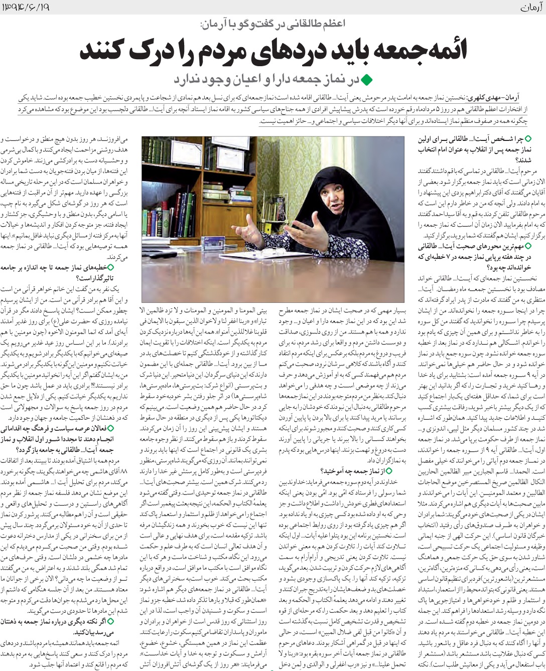 اعظم طالقانی اعظم طالقانی گفت وگو با آرمان:ائمه جمعه باید دردهای مردم را درک کنند اعظم طالقانی گفت وگو با آرمان:ائمه جمعه باید دردهای مردم را درک کنند ادامه... aA aA قلم کوچکتر قلم بزرگتر اشتراکگذاری