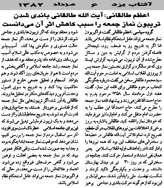 اعظم طالقانی اعظم طالقانی: آیت الله طالقانی باندی شدن تریبون نماز جمعه را سبب کاهش اثرآن می دانست- آفتاب یزد 6-5-82 اعظم طالقانی: آیت الله طالقانی باندی شدن تریبون نماز جمعه را سبب کاهش اثرآن می دانست- آفتاب یزد 6-5-82 ادامه... aA aA قلم کوچکتر قلم بزرگتر اشتراکگذاری